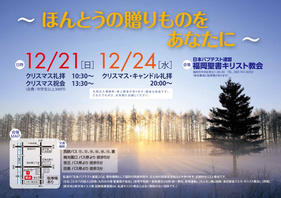 福岡聖書キリスト教会(バイブルチャーチ・フクオカ)は、「日本バプテスト連盟」に属しています。「日本バプテスト連盟」の関係機関としては、西南学院、西南女学院などがあります。聖書信仰に立つ、正統的なキリスト教会です。