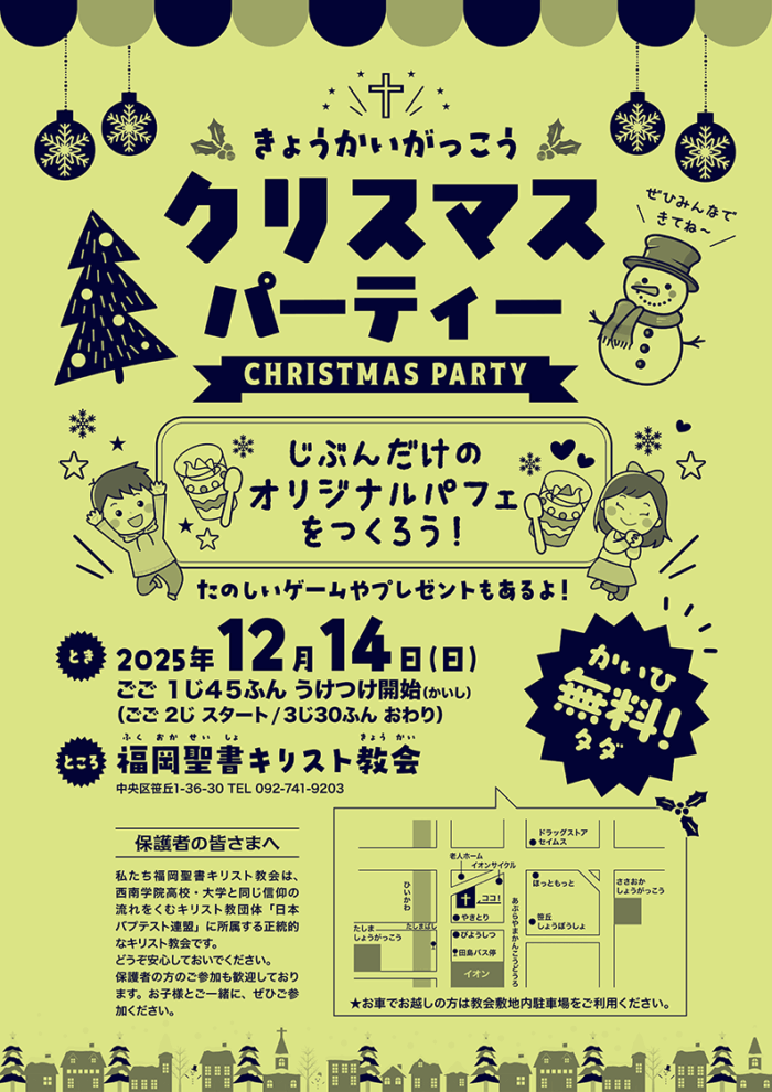 2025年12月14日(日)の14時~、CS教会学校子どもクリスマス会が行われます。開催場所は当教会(福岡聖書キリスト教会)で、参加費は無料です。