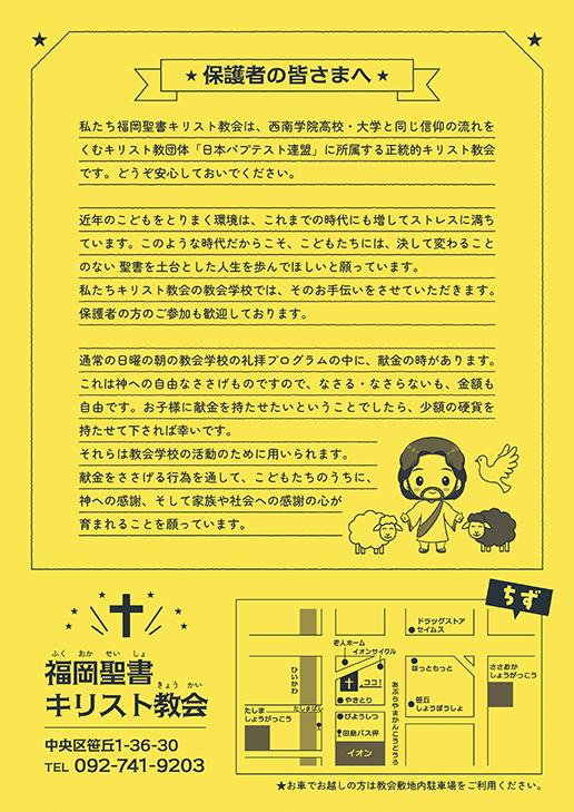 ※教会前の道路は、「梅光園三丁目」交差点からの一方通行(油山観光道路側→樋井川側)となっていますので、お越しの際・お帰りの際には、お気をつけください。